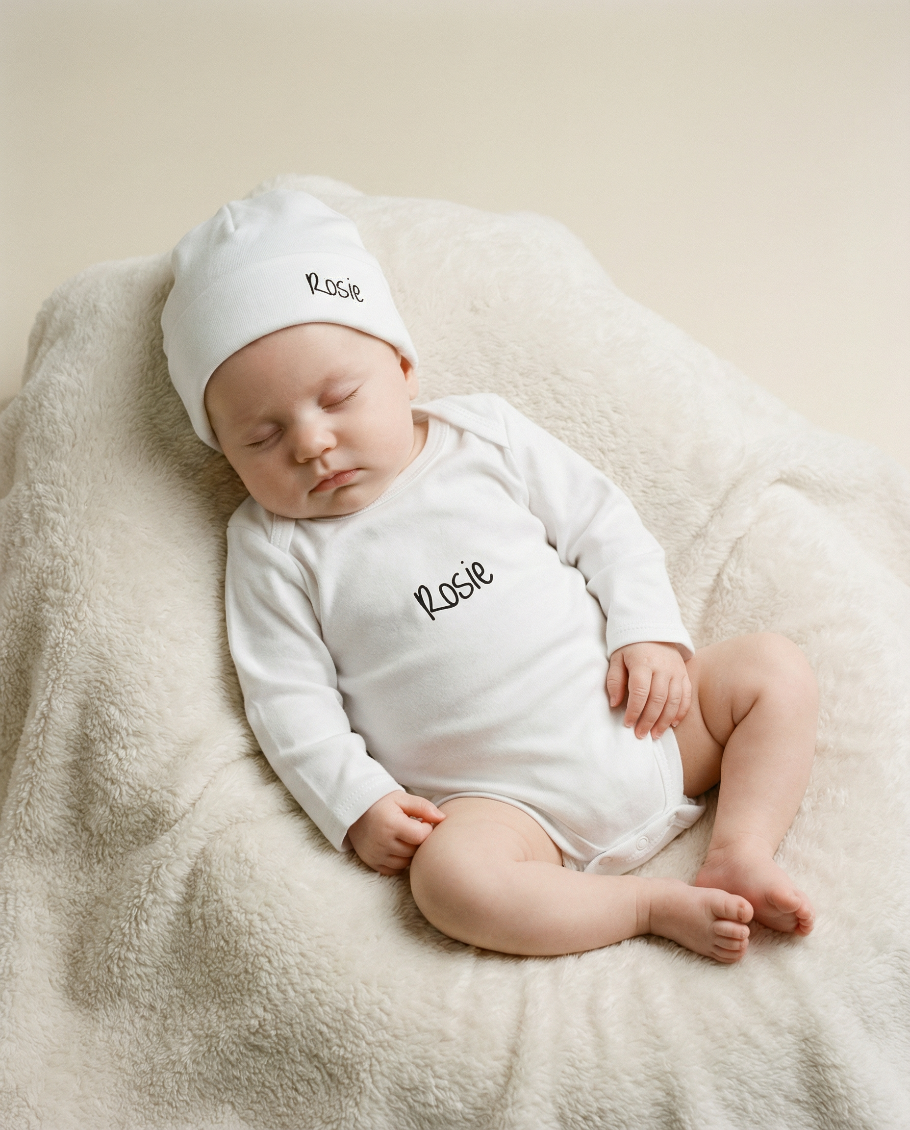 Das Set enthält einen weichen Strampler und eine passende Mütze , beide mit dem Namen Ihres Babys bedruckt – eine schöne und liebevolle Art, Freunden und Familie die Neuigkeit mitzuteilen.
